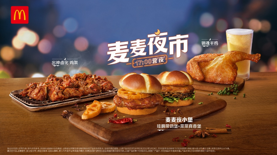 Under the trend of China's "night economy", McDonald's joined hands with the 180 Shanghai team to launch a brand new platform, "MaiMai Night Market", on May 11th. After 17:00, the debut of the new "McMac Night Burger" and "Chicken Rack", together with the previously launched popular single product "Soulful Half Chicken" to form an exclusive night market menu, online and offline simultaneous sale.