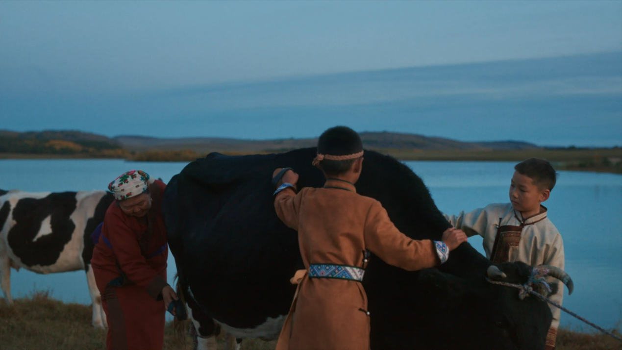 画面聚焦少年、骑射的少女、挤奶牧民与奶牛的自然互动,强化「原生」「纯净」的感知。