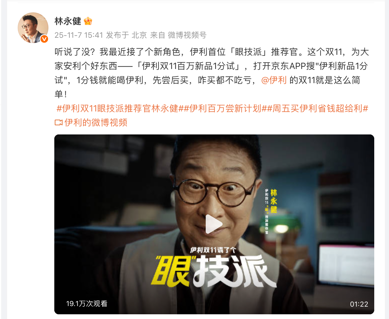 在双11这个信息过载的战场上,品牌如何杀出重围?伊利本次双11战役,没有选择常规的促销语言,而是另辟蹊径,与国民演员林永健老师合作,开创性地将其打造为「伊利首个眼技派双11推荐官」,打出了一张极具辨识度的“人设牌”。