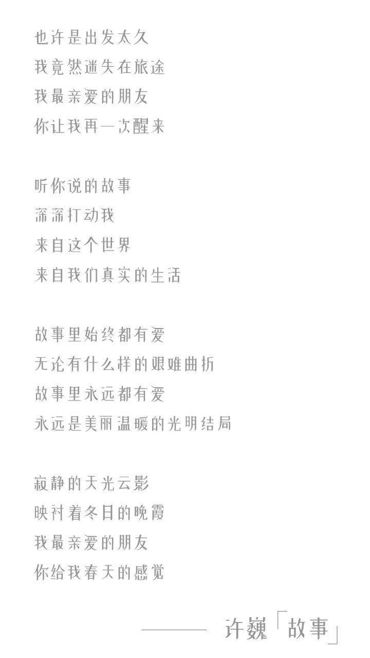 这是许巍的一首“小众歌曲”,却属实是遗珠宝藏。他歌唱每一个为生活拼命、为生命努力写下灿烂故事的人,他相信始终有爱,相信美丽温暖的光明结局。歌从旋律到内核,都与我们的创意不谋而合。有诗有歌,才算是完满。