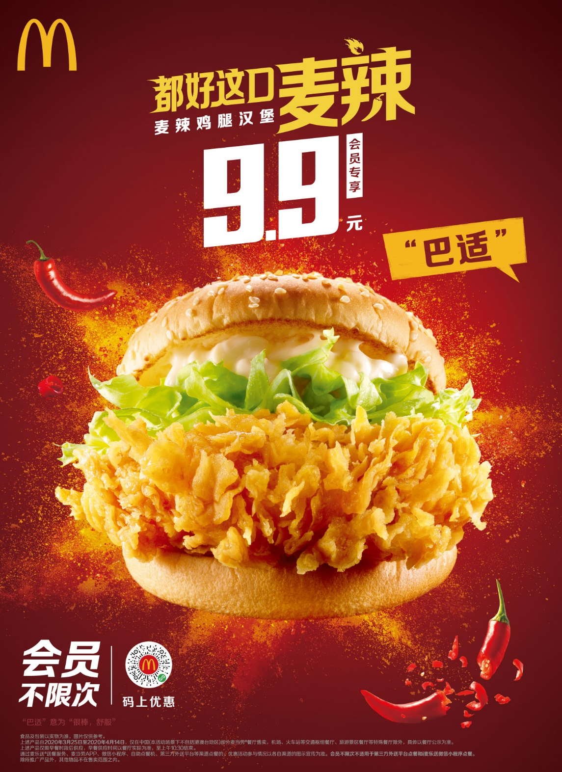 3月25日,麦当劳上线了一支“方言味”宣传片,顺势推出会员不限次的9块9麦辣鸡腿汉堡。