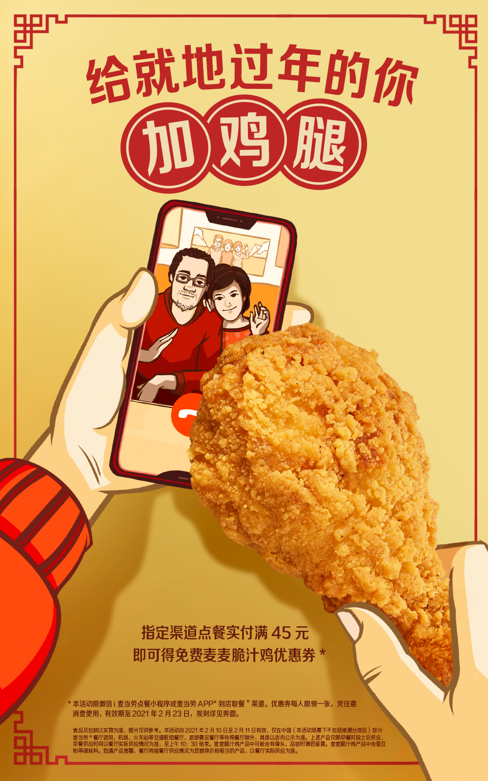 有了!这不是和我们“心在一起,就是金金有味的年”的idea不谋而合吗?麦当劳和家人一样,也和你心在一起。不能回家,麦当劳给你加鸡腿,一样过个金金有味的年。