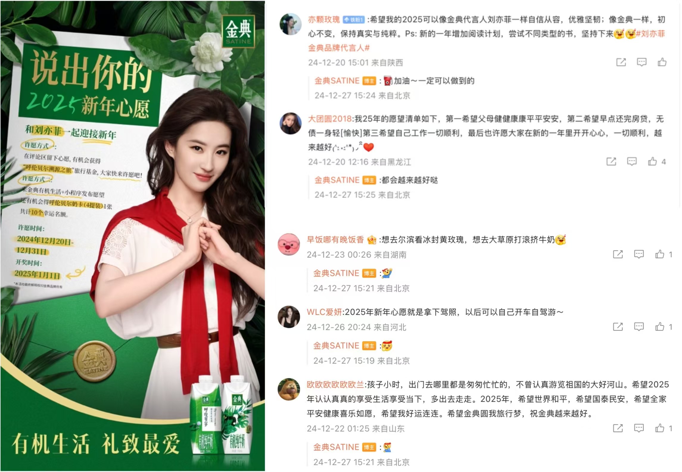 我们决定将金典的“有机生活 有我定义”理念与代言人刘亦菲“真实自在”的人设结合起来,用一个简单但温暖的方式:让刘亦菲读出大家的新年“小”心愿并送上她的祝福,为每一个平凡的心愿赋予新年的仪式感,传递有机的生活态度。