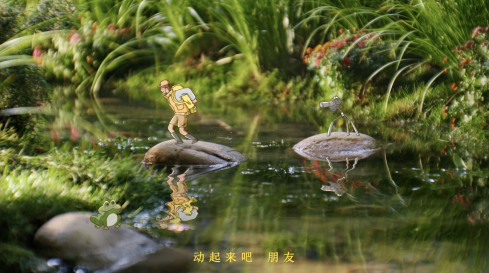 当她念到“想按下暂停键 去户外放松一下”时,画面中身穿户外装备的动画人物穿梭在山林间,仿佛真的踏入了一个野趣盎然的秘境。