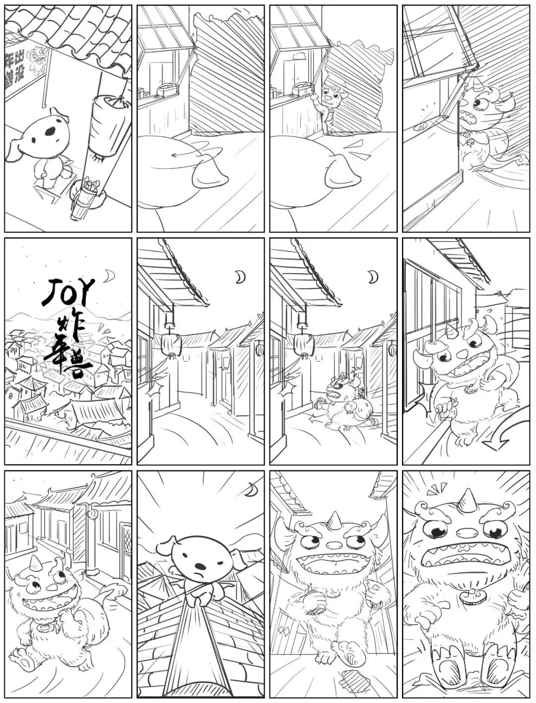 而为了配合“春节”这个重要时间点的节日氛围,在分镜脚本绘制、角色设定以及场景氛围图创作阶段,壹捌零和VHQ制作团队也做了充分考虑。