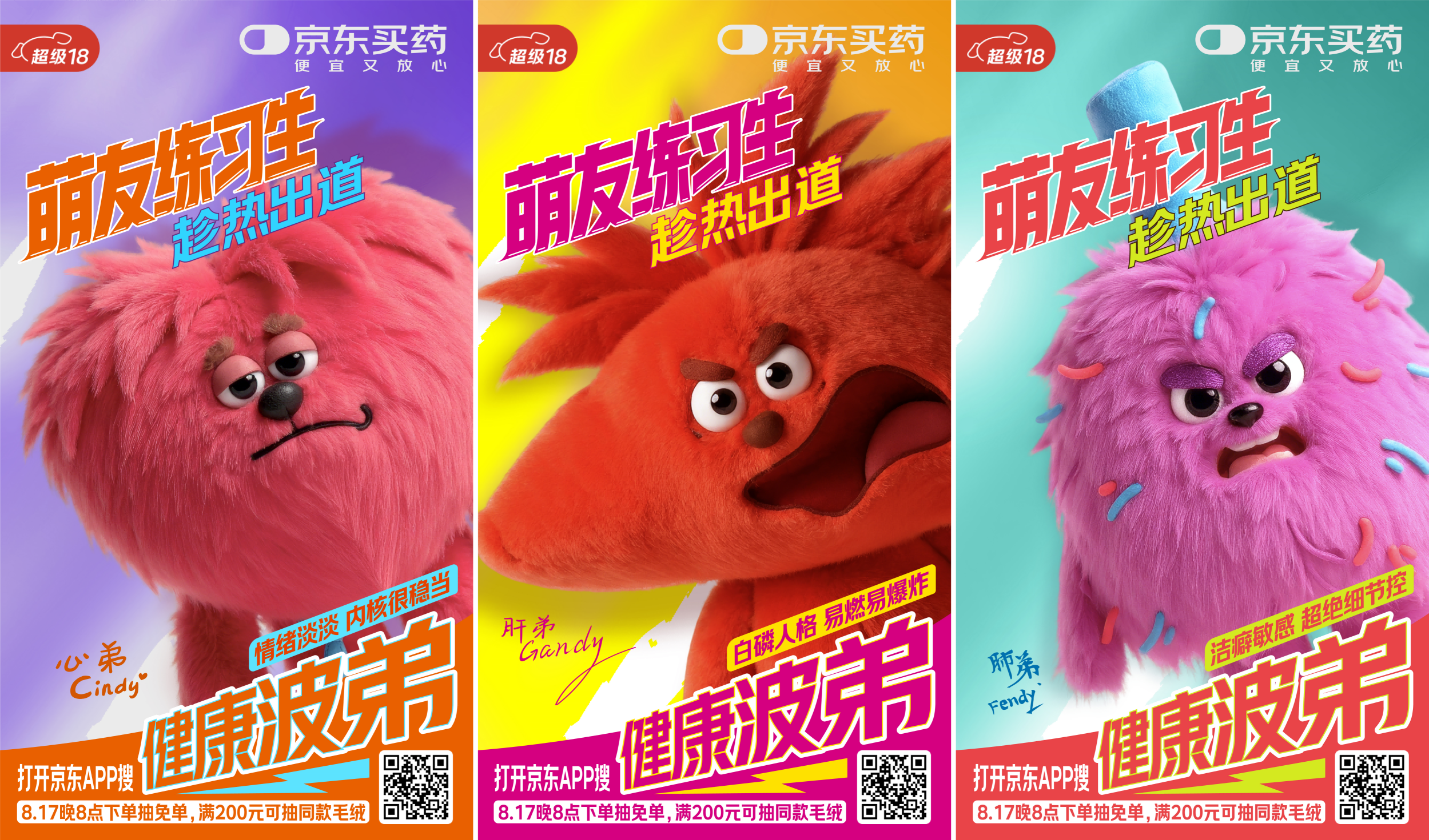 以人体器官为原型设计「健康波弟body」系列IP,核心概念来自对“健康body”的年轻化表达,包含心弟Cindy(情绪淡淡内核稳定)、肝弟Gandy(白磷人格易燃易炸)、肺弟Fendy(洁癖敏感细节控)三个拟人化角色,后续将继续推出其他器官拟人化形象以及打造IP世界观,通过萌系形象和反差人设传递健康知识,降低用户对健康管理的认知门槛。