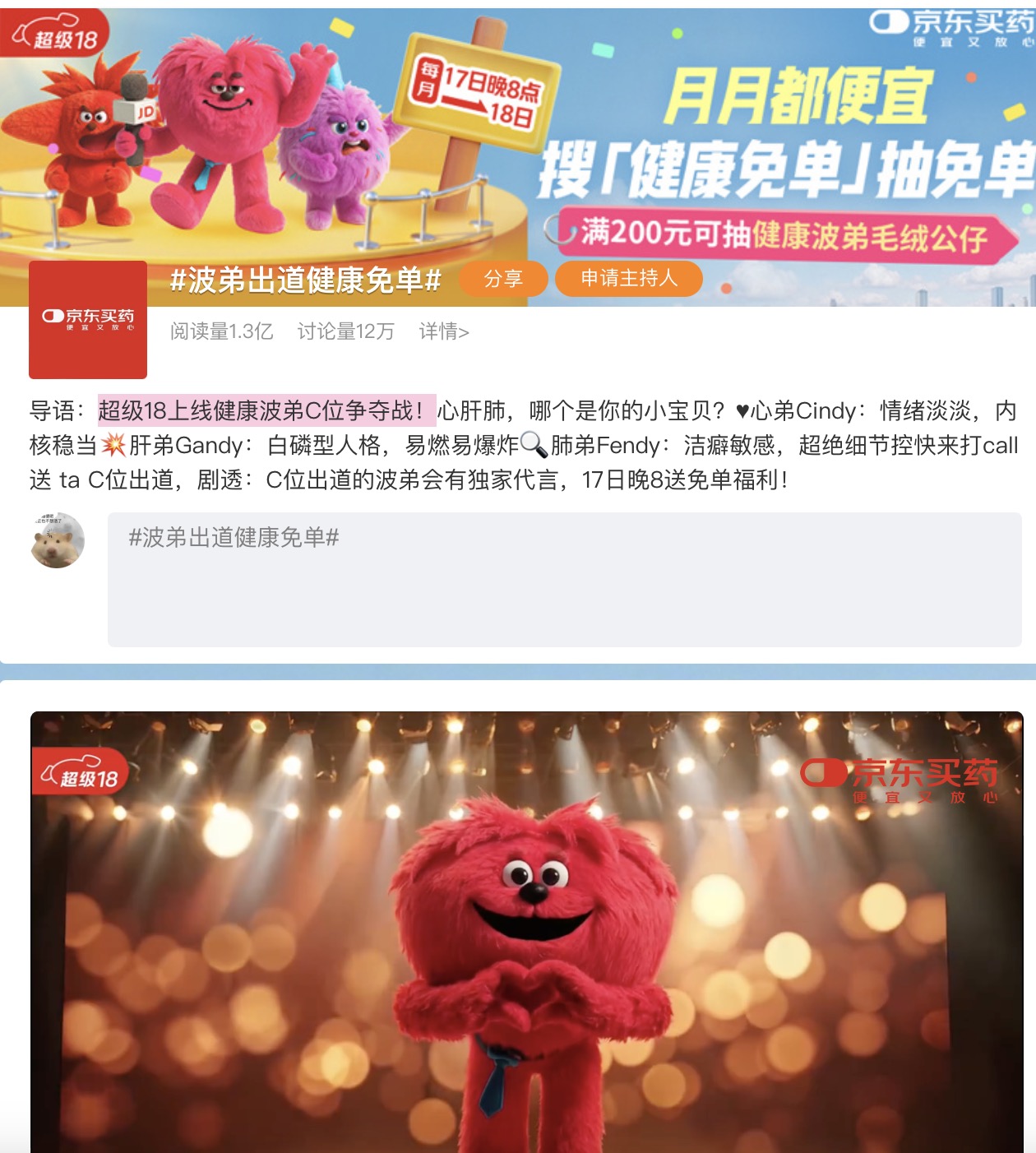 在微博平台,3个IP形象成为「京东健康超级18萌友练习生」C位竞争机制出道:通过用户投票或互动(如应援词创作、打call抽奖)决定C位归属,增强用户参与感与归属感。最终心弟以“断层优势”胜出,形成固定团运营模式延续IP生命力。